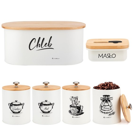 Pojemniki kuchenne zostały zaprojektowane tak, aby spełniać wszystkie potrzeby Twojej kuchni. Są odporne na uszkodzenia mechaniczne oraz łatwe do utrzymania w czystości. Wykonane z metalu malowanego proszkowo na kolor biały. Pokrywy wykonane z drewna bambusowego. W pokrywie maselniczki nożyk do smarowania umieszczony w wyprofilowanym zagłębieniu.