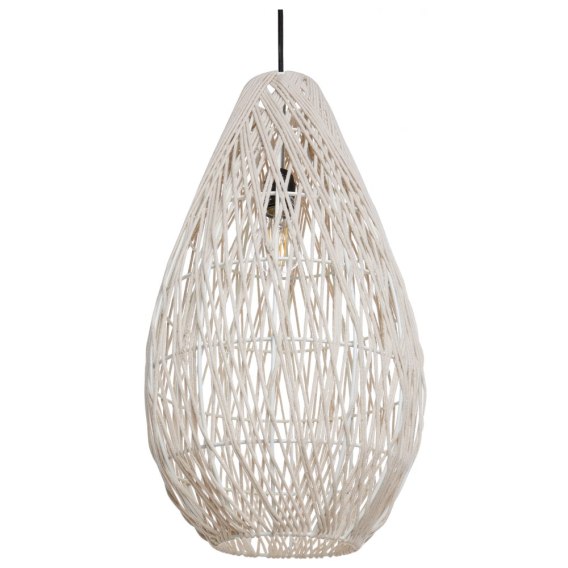 Ta lampa wisząca, o podłużnym kształcie, wykonana została ręcznie z bawełny. Na jej nietypowy wygląd wpływają sploty linek, które tworzą klosz w kształcie klatki - to umożliwia lampie oświetlenie pomieszczenia miękkim, przyjemnym światłem, które zapewni ciepłą i domową atmosferę czy to w salonie, sypialni czy jadalni. Naturalny materiał sprawia, że akcesorium będzie wspaniałą ozdobą we wnętrzach boho czy Japandi.
