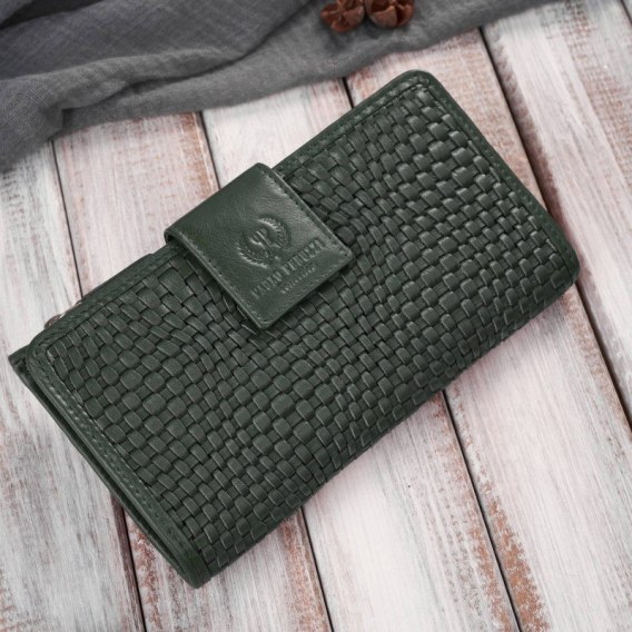 • Portfel damski skórzany w kolorze butelkowej zieleni duży pleciony Paolo Peruzzi AY-08-GB