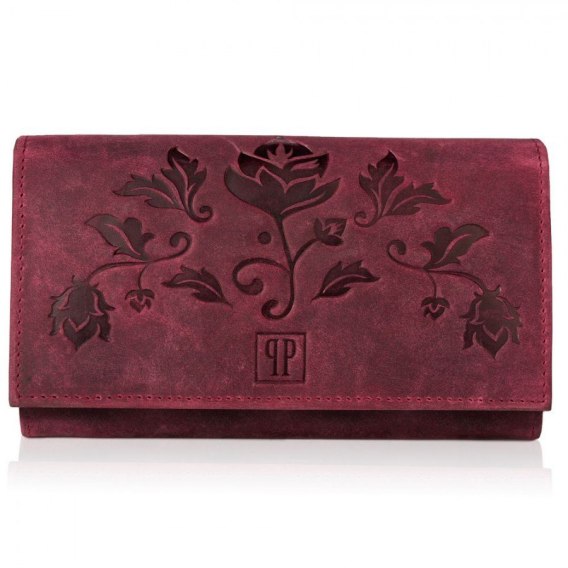 Portfel damski w kwiaty, średniej wielkości. Wykonany ze skóry naturalnej postarzanej z tłoczeniami na froncie. Wewnątrz 2 przegrody na banknoty, 6 schowków w tym kieszonka na suwak. Dodatkowo 7 przegród na karty kredytowe i transparentna kieszeń, wewnątrz wszywana membrana RFID. Charakterystyka Model: T-44-CHRProducent: Paolo PeruzziMateriał: skóra naturalna postarzana Kolor: różowyIlość przegród na karty: 7 + 1 transparentna Przegroda na banknoty: 2Ilość schowków: 6Kieszeń na bilon: takOrientacja: poziomaOchrona RFID: tak Wymiary Wysokość: 10 cm Szerokość: 16 cmGłębokość: 3 cm
